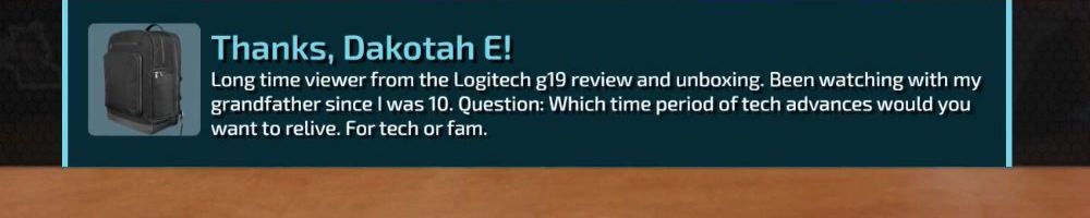 Thanks, Dakotah E! Long time viewer from the Logitech g19 review and unboxing. Been watching with my grandfather since I was 10. Question: Which time period of tech advances would you want to relive. For tech or fam.