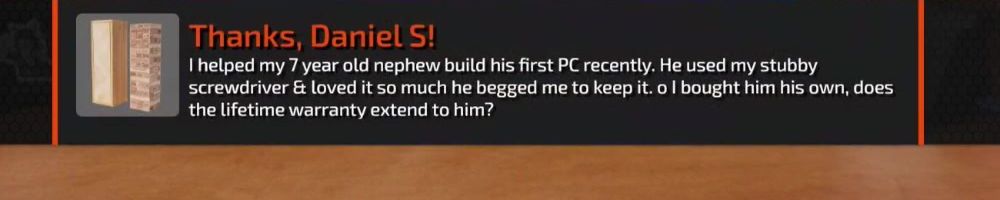Thanks, Daniel S! I helped my 7 year old nephew build his first PC recently. He used my stubby screwdriver & loved it so much he begged me to keep it. o I bought him his own, does the lifetime warranty extend to him?