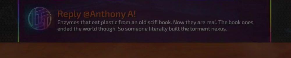 Reply @Anthony A! Enzymes that eat plastic from an old scifi book. Now they are real. The book ones ended the world though. So someone literally built the torment nexus.