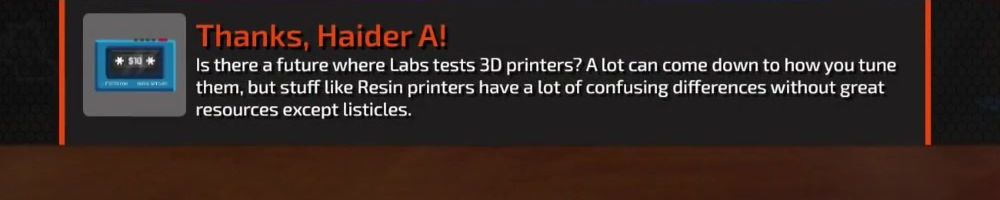 Thanks, Haider A! Is there a future where Labs tests 3D printers? A lot can come down to how you tune them, but stuff like Resin printers have a lot of confusing differences without great resources except listicles.