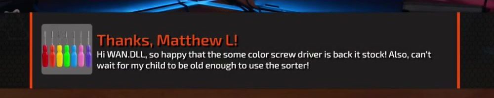Thanks, Matthew L! Hi WAN.DLL, so happy that the some color screw driver is back it stock! Also, can't wait for my child to be old enough to use the sorter!