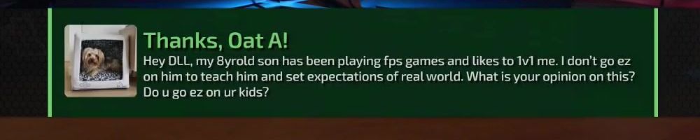 Thanks, Oat A! Hey DLL, my 8yrold son has been playing fps games and likes to 1v1 me. I don't go ez on him to teach him and set expectations of real world. What is your opinion on this? Do u go ez on ur kids?