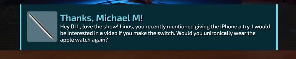 Thanks, Michael M! Hey DLL, love the show! Linus, you recently mentioned giving the iPhone a try. I would be interested in a video if you make the switch. Would you unironically wear the apple watch again?