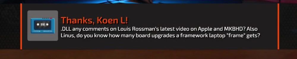 Thanks, Koen L! .DLL any comments on Louis Rossman's latest video on Apple and MKBHD? Also Linus, do you know how many board upgrades a framework laptop "frame" gets?