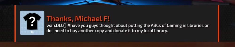 Thanks, Michael F! wan.DLL() #have you guys thought about putting the ABCs of Gaming in libraries or do I need to buy another copy and donate it to my local library.