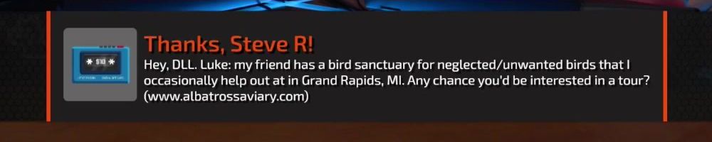 Thanks, Steve R! Hey, DLL. Luke: my friend has a bird sanctuary for neglected/unwanted birds that I occasionally help out at in Grand Rapids, MI. Any chance you'd be interested in a tour? (www.albatrossaviary.com)