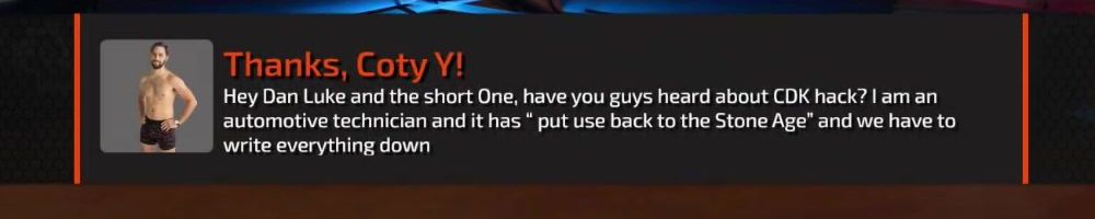 Thanks, Coty Y! Hey Dan Luke and the short One, have you guys heard about CDK hack? I am an automotive technician and it has "put use back to the Stone Age" and we have to write everything down