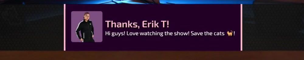 Thanks, Erik T! Hi guys! Love watching the show! Save the cats 🐱!
