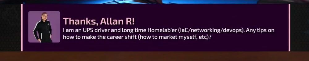 Thanks, Allan R! I am an UPS driver and long time Homelab'er (laC/networking/devops). Any tips on how to make the career shift (how to market myself, etc)?