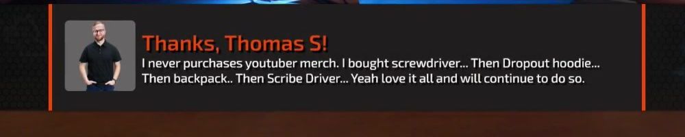 Thanks, Thomas S! I never purchases youtuber merch. I bought screwdriver... Then Dropout hoodie... Then backpack.. Then Scribe Driver... Yeah love it all and will continue to do so.