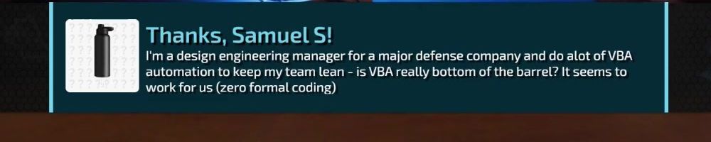 Thanks, Samuel S! I'm a design engineering manager for a major defense company and do alot of VBA automation to keep my team Lean - is VBA really bottom of the barrel? It seems to work for us (zero formal coding)