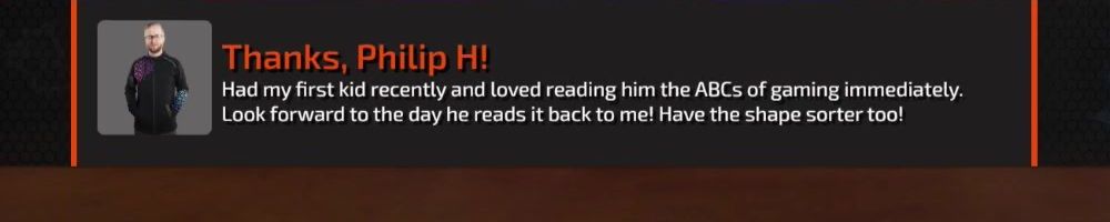 Thanks, Philip H! Had my first kid recently and loved reading him the ABCs of gaming immediately. Look forward to the day he reads it back to me! Have the shape sorter too!