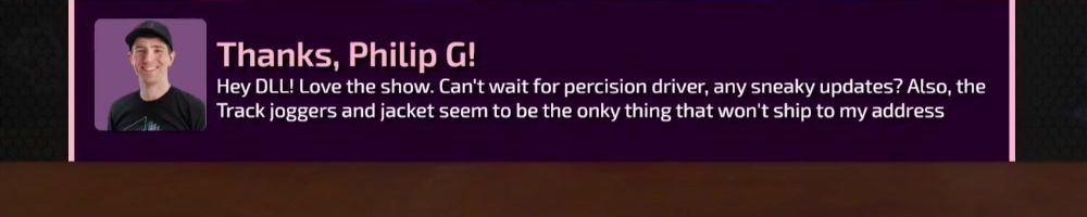 Thanks, Philip G! Hey DLL! Love the show. Can't wait for percision driver, any sneaky updates? Also, the Track joggers and jacket seem to be the onky thing that won't ship to my address