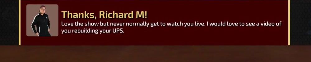 Thanks, Richard M! Love the show but never normally get to watch you live. I would love to see a video of you rebuilding your UPS.