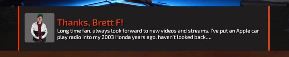 Thanks, Brett F! Long time fan, always look forward to new videos and streams. I've put an Apple car play radio into my 2003 Honda years ago, haven't looked back....