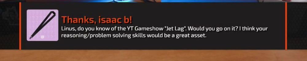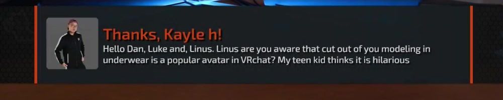Thanks, Kayle h! Hello Dan, Luke and, Linus. Linus are you aware that cut out of you modeling in underwear is a popular avatar in VRchat? My teen kid thinks it is hilarious