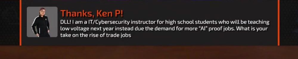 Thanks, Ken P! DLL! I am a IT/Cybersecurity instructor for high school students who will be teaching low voltage next year instead due the demand for more "AI" proof jobs. What is your take on the rise of trade jobs