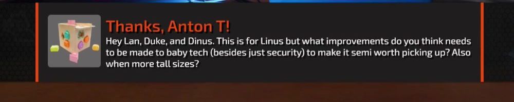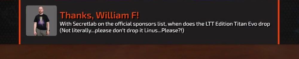 Thanks, William F! With Secretlab on the official sponsors list, when does the LTT Edition Titan Evo drop (Not literally...please don't drop it Linus...Please?!)