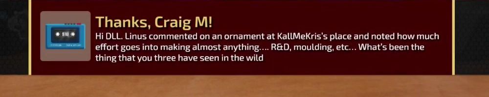 Thanks, Craig M! Hi DLL. Linus commented on an ornament at KallMeKris's place and noted how much effort goes into making almost anything... R&D, moulding, etc... What's been the thing that you three have seen in the wild