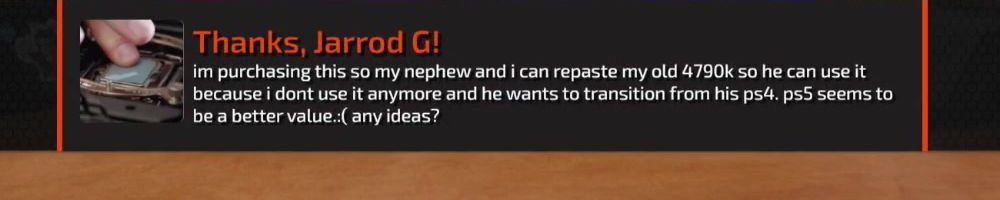 Thanks, Jarrod G! im purchasing this so my nephew and i can repaste my old 4790k so he can use it because i dont use it anymore and he wants to transition from his ps4. ps5 seems to be a better value.:( any ideas?