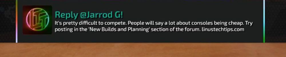 Reply @Jarrod G! It's pretty difficult to compete. People will say a lot about consoles being cheap. Try posting in the 'New Builds and Planning' section of the forum. linustechtips.com
