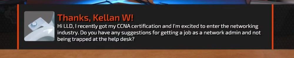 Thanks, Kellan W! Hi LLD, I recently got my CCNA certification and I'm excited to enter the networking industry. Do you have any suggestions for getting a job as a network admin and not being trapped at the help desk?