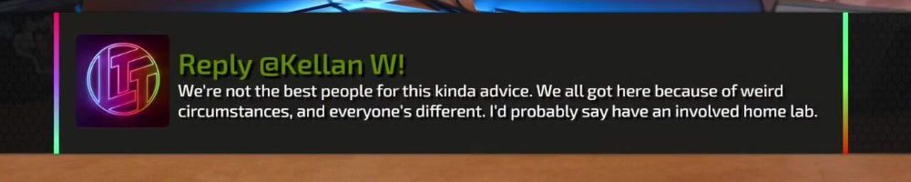 Reply @Kellan W! We're not the best people for this kinda advice. We all got here because of weird circumstances, and everyone's different. I'd probably say have an involved home lab.
