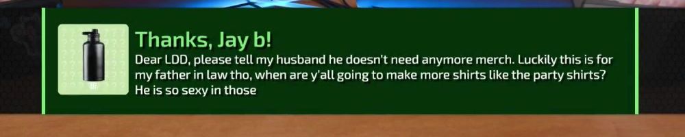 Thanks, Jay b! Dear LDD, please tell my husband he doesn't need anymore merch. Luckily this is for my father in law tho, when are y'all going to make more shirts like the party shirts? He is so sexy in those