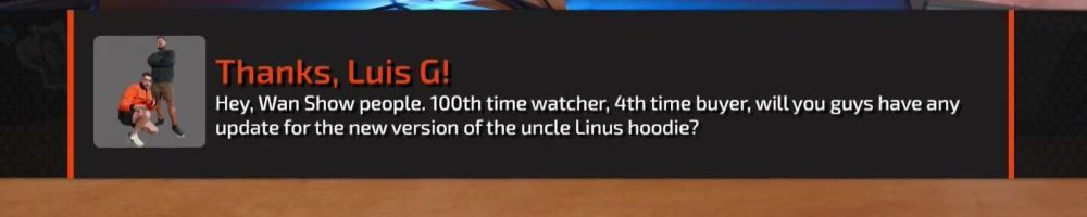 Thanks, Luis G! Hey, Wan Show people. 100th time watcher, 4th time buyer, will you guys have any update for the new version of the uncle Linus hoodie?