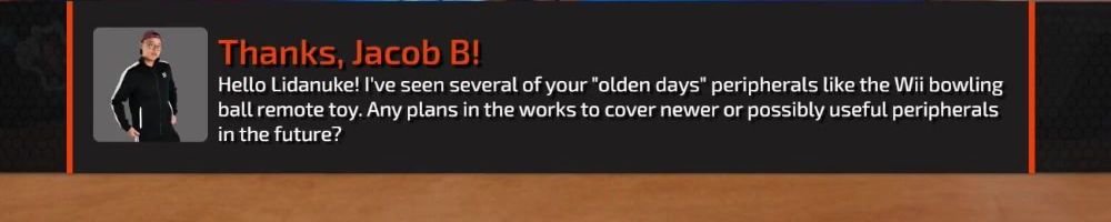 Thanks, Jacob B! Hello Lidanuke! I've seen several of your "olden days" peripherals like the Wii bowling ball remote toy. Any plans in the works to cover newer or possibly useful peripherals in the future?