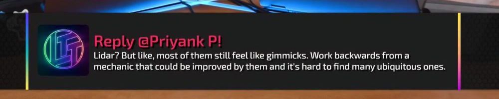 Reply @Priyank P! Lidar? But like, most of them still feel like gimmicks. Work backwards from a mechanic that could be improved by them and it's hard to find many ubiquitous ones.