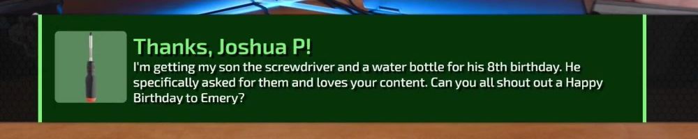 Thanks, Joshua P! I'm getting my son the screwdriver and a water bottle for his 8th birthday. He specifically asked for them and loves your content. Can you all shout out a Happy Birthday to Emery?