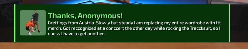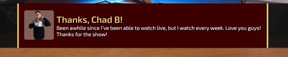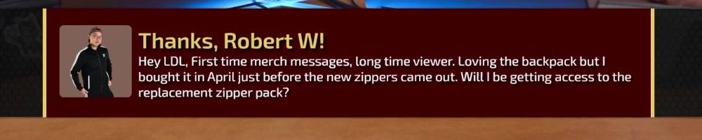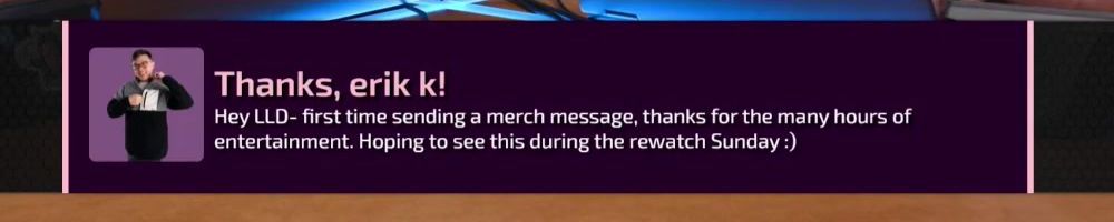 Thanks, erik k! Hey LLD- first time sending a merch message, thanks for the many hours of entertainment. Hoping to see this during the rewatch Sunday :)