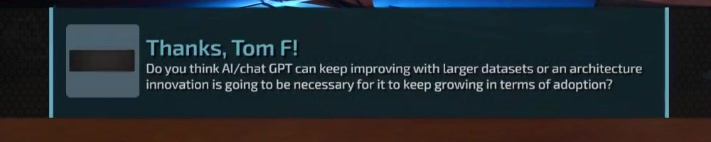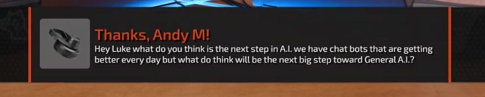 Thanks, Andy M! Hey Luke what do you think is the next step in A.I. we have chat bots that are getting better every day but what do you think will be the next big step toward General A.I.?