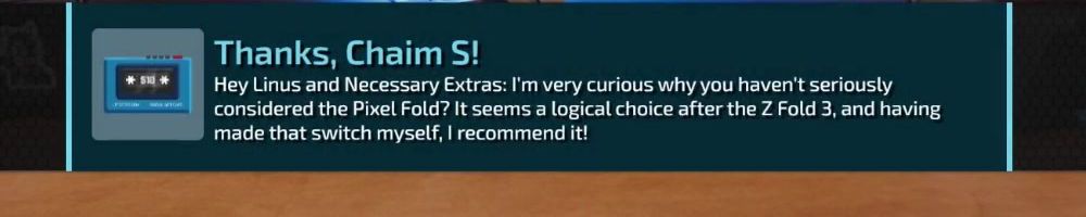 Thanks, Chaim S! Hey Linus and Necessary Extras: I'm very curious why you haven't seriously considered the Pixel Fold? It seems a logical choice after the Z Fold 3, and having made that switch myself, I recommend it!