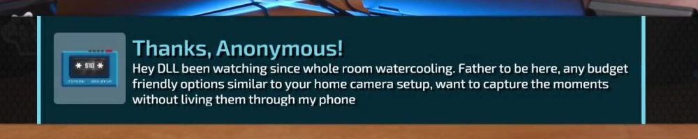 Thanks, Anonymous! Hey DLL been watching since whole room watercooling. Father to be here, any budget friendly options similar to your home camera setup, want to capture the moments without living them through my phone