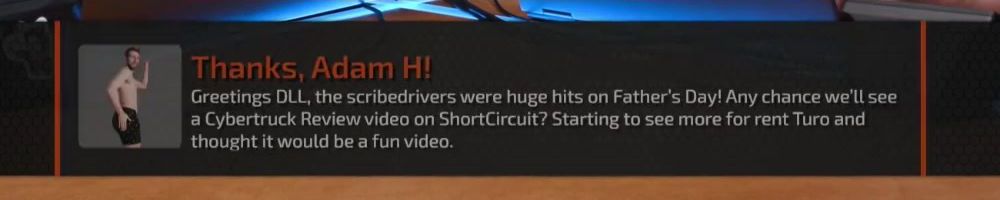 Thanks, Adam H! Greetings DLL, the scribedrivers were huge hits on Father's Day! Any chance we'll see a Cybertruck Review video on ShortCircuit? Starting to see more for rent Turo and thought it would be a fun video.