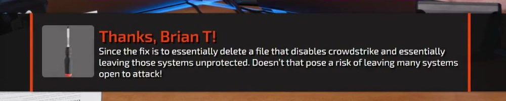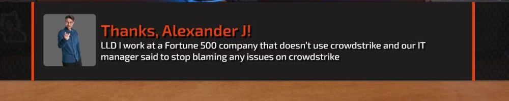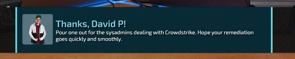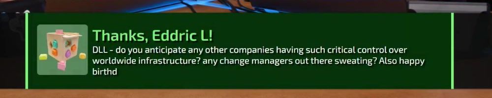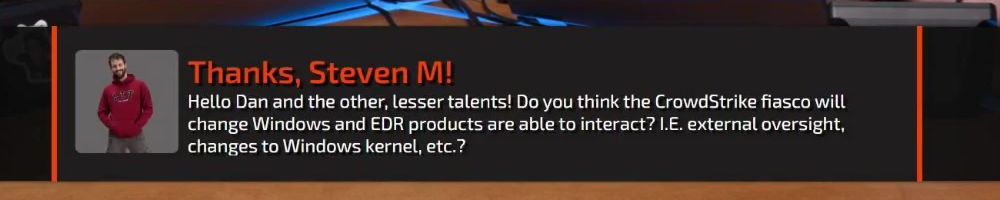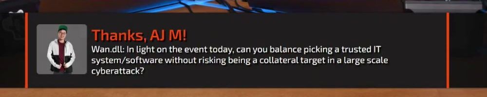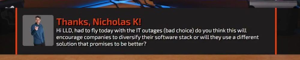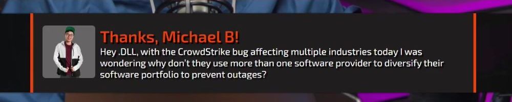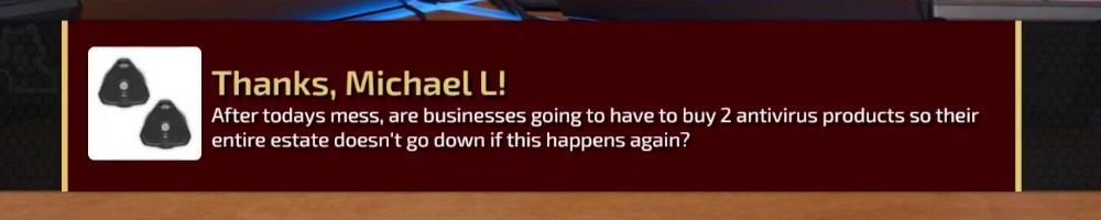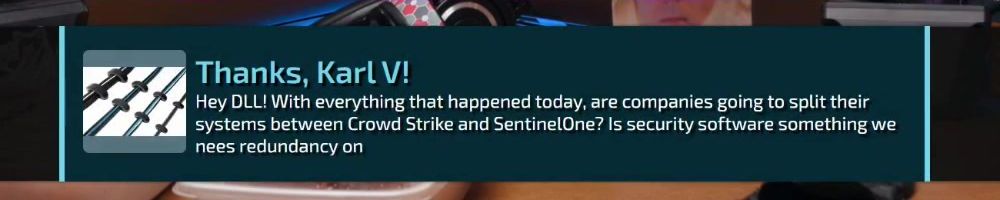 Hey DLL! With everything that happened today, are companies going to split their systems between Crowd Strike and SentinelOne? Is security software something we nees redundancy on