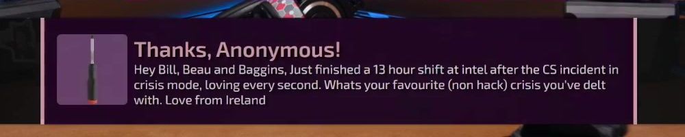 Hey Bill, Beau and Baggins, Just finished a 13 hour shift at intel after the CS incident in crisis mode, loving every second. Whats your favourite (non hack) crisis you've delt with. Love from Ireland