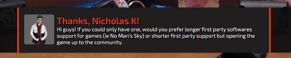 Hi guys! If you could only have one, would you prefer longer first party softwares support for games (ie No Man's Sky) or shorter first party support but opening the game up to the community.