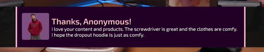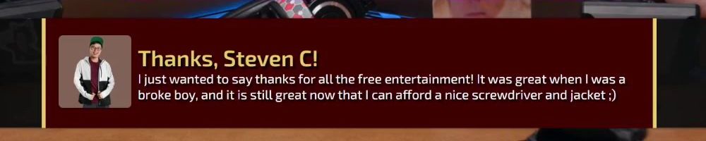 I just wanted to say thanks for all the free entertainment! It was great when I was a broke boy, and it is still great now that I can afford a nice screwdriver and jacket ;)