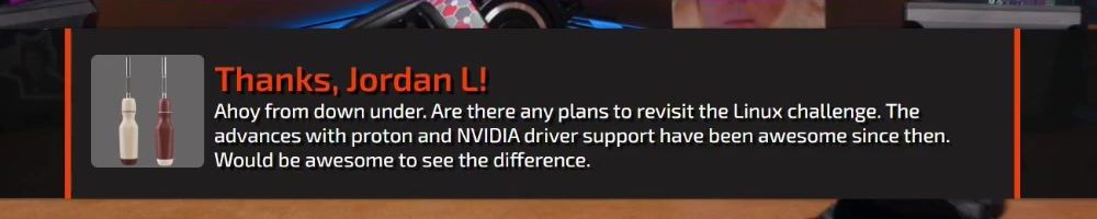Ahoy from down under. Are there any plans to revisit the Linux challenge. The advances with proton and NVIDIA driver support have been awesome since then. Would be awesome to see the difference.