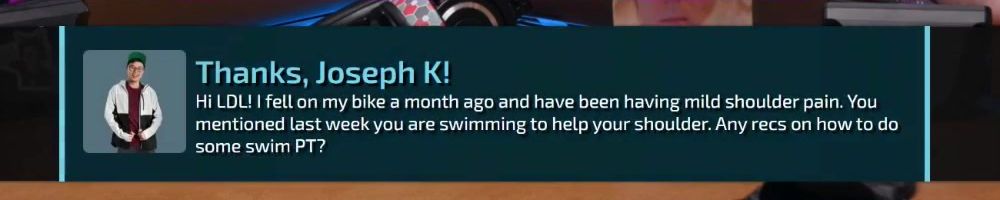Hi LDL! I fell on my bike a month ago and have been having mild shoulder pain. You mentioned last week you are swimming to help your shoulder. Any recs on how to do some swim PT?