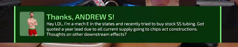 Hey LDL, I'm a mech E in the states and recently tried to buy stock SS tubing. Got quoted a year lead due to all current supply going to chips act constructions. Thoughts on other downstream effects?