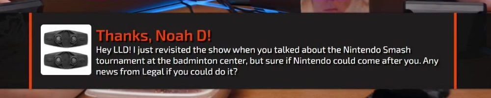 Hey LLD! I just revisited the show when you talked about the Nintendo Smash tournament at the badminton center, but sure if Nintendo could come after you. Any news from Legal if you could do it?