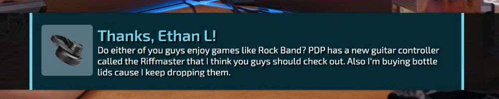 Do either of you guys enjoy games like Rock Band? PDP has a new guitar controller called the Riffmaster that I think you guys should check out. Also I'm buying bottle lids cause I keep dropping them.