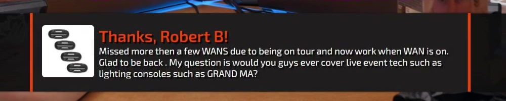 Missed more than a few WANS due to being on tour and now work when WAN is on. Glad to be back. My question is would you guys ever cover live event tech such as lighting consoles such as GRAND MA?