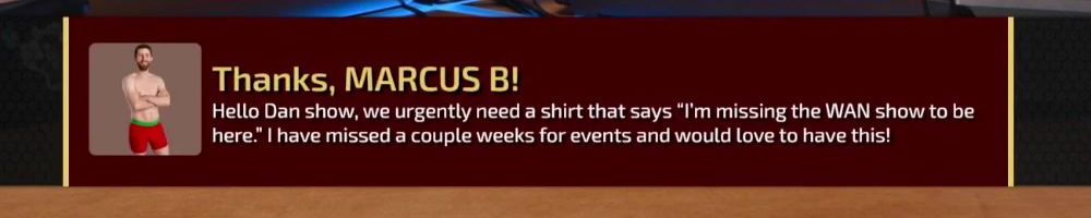 Hello Dan show, we urgently need a shirt that says “I'm missing the WAN show to be here.” I have missed a couple weeks for events and would love to have this!