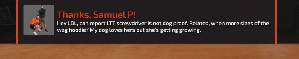 Hey LDL, can report LTT screwdriver is not dog proof. Related, when more sizes of the wag hoodie? My dog loves hers but she's getting growing.