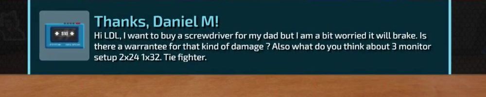 Hi LDL, I want to buy a screwdriver for my dad but I am a bit worried it will brake. Is there a warrantee for that kind of damage? Also what do you think about 3 monitor setup 2x24 1x32. Tie fighter.